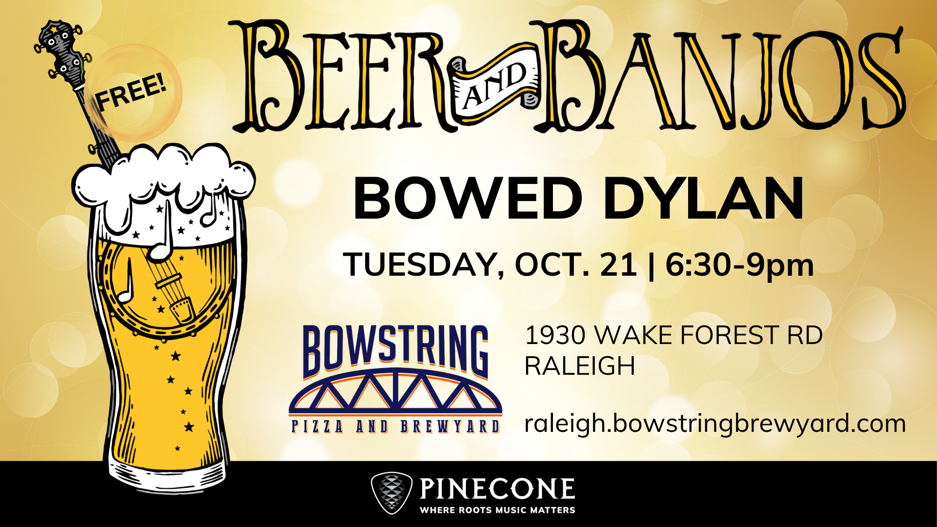 Hear Bob Dylan songs with a twangy twist from Chapel Hill tribute band Bowed Dylan at this week’s Beer and Banjos at Bowstring Brewyard in Raleigh. How does it feeeeeeel? Join us anytime between 6:30 and 9 p.m. to find out!