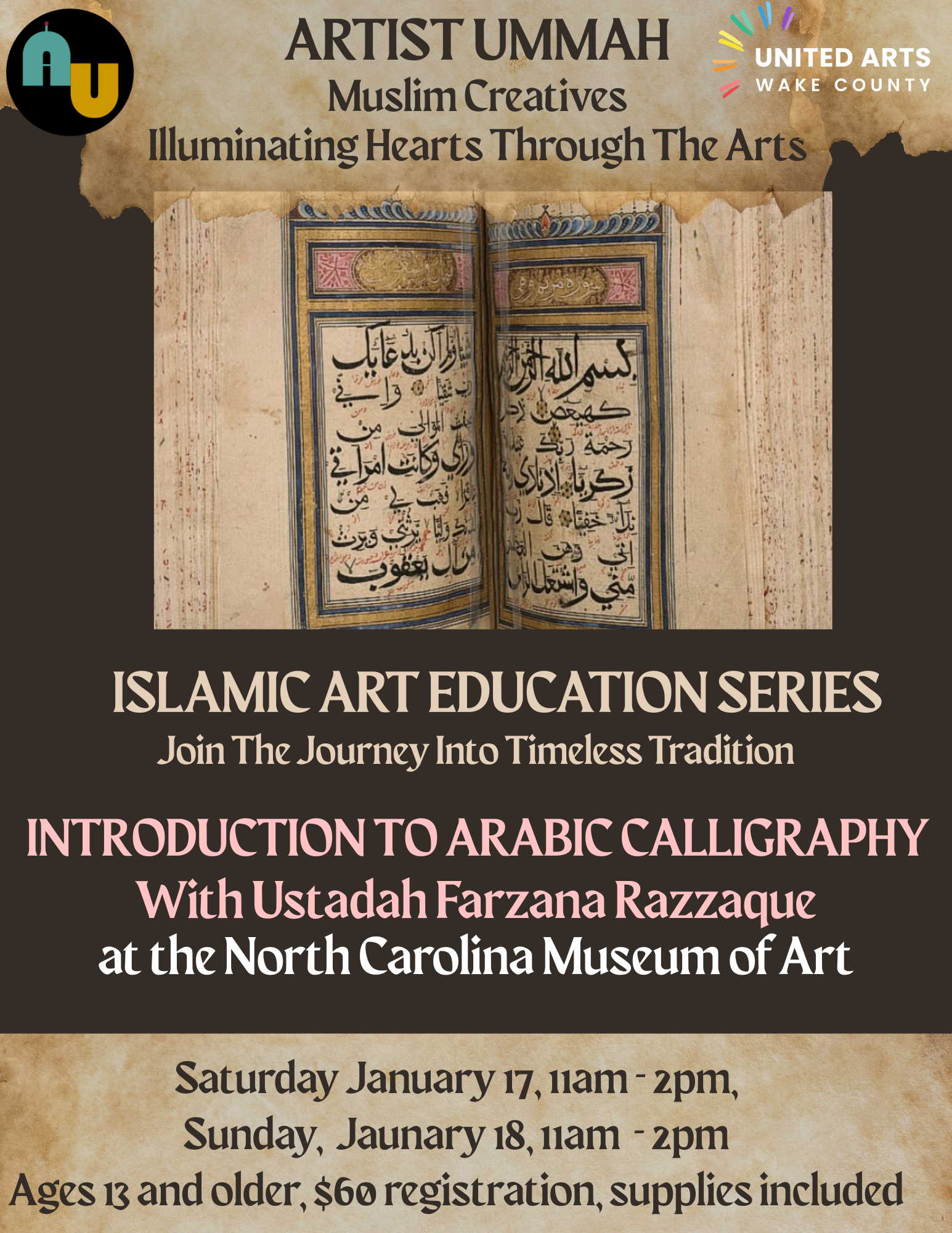 Join the Journey into Timeless Tradition Artist Ummah is thrilled to welcome Arabic Calligraphy Master, Farzana Razzaque, for an in-person introduction to Arabic Calligraphy workshop--hosted by the North Carolina Museum of Art. This special two day experience invites the Triangle community to discover the beauty, discipline, and spirit of the traditional Islamic Arts. Arabic language…